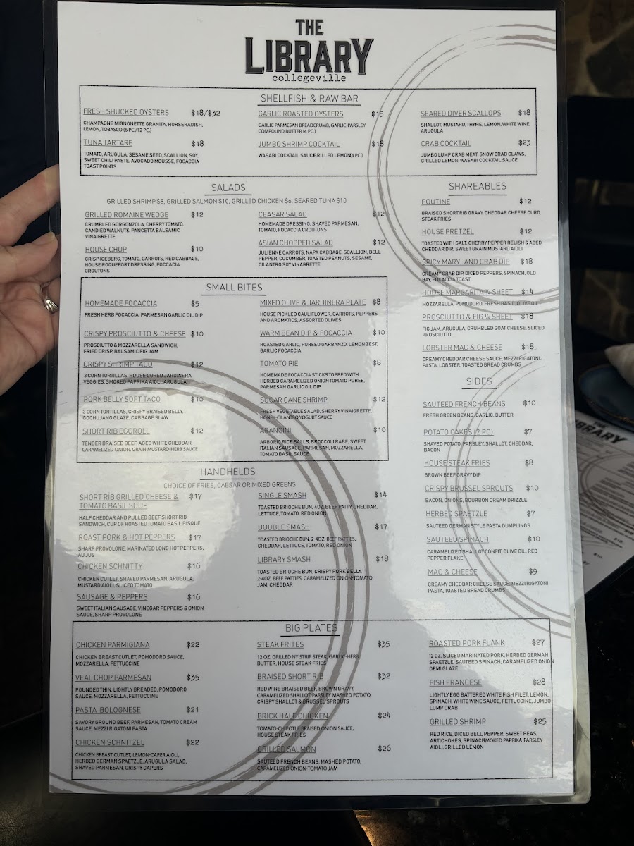 Welcome to The Library, a delightful gem located at 217 E Main St, Collegeville, PA. This charming restaurant invites patrons to experience a menu that expertly blends comfort and sophistication. From fresh, vibrant salads like the House Chop and Ceasar Salad to shareables such as Lobster Mac & Cheese and Spicy Maryland Crab Dip, every dish reflects culinary creativity and robust flavors.